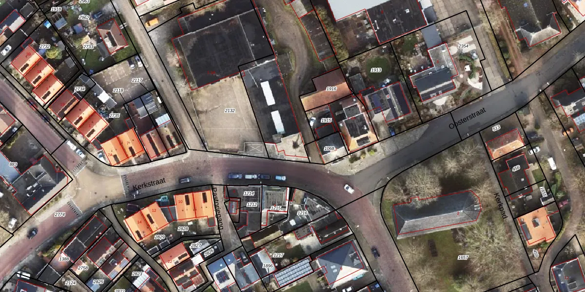 Het perceel waarop Kerkstraat 1-A staat heeft een oppervlakte van 2540 m². Dit is een zeer groot perceel. De perceeloppervlakte wordt geregistreerd door het Kadaster. Gedetailleerde informatie over de maten van dit perceel kunt u vinden in het rapport Kadastrale kaart met maatvoering van Kerkstraat 1-A.