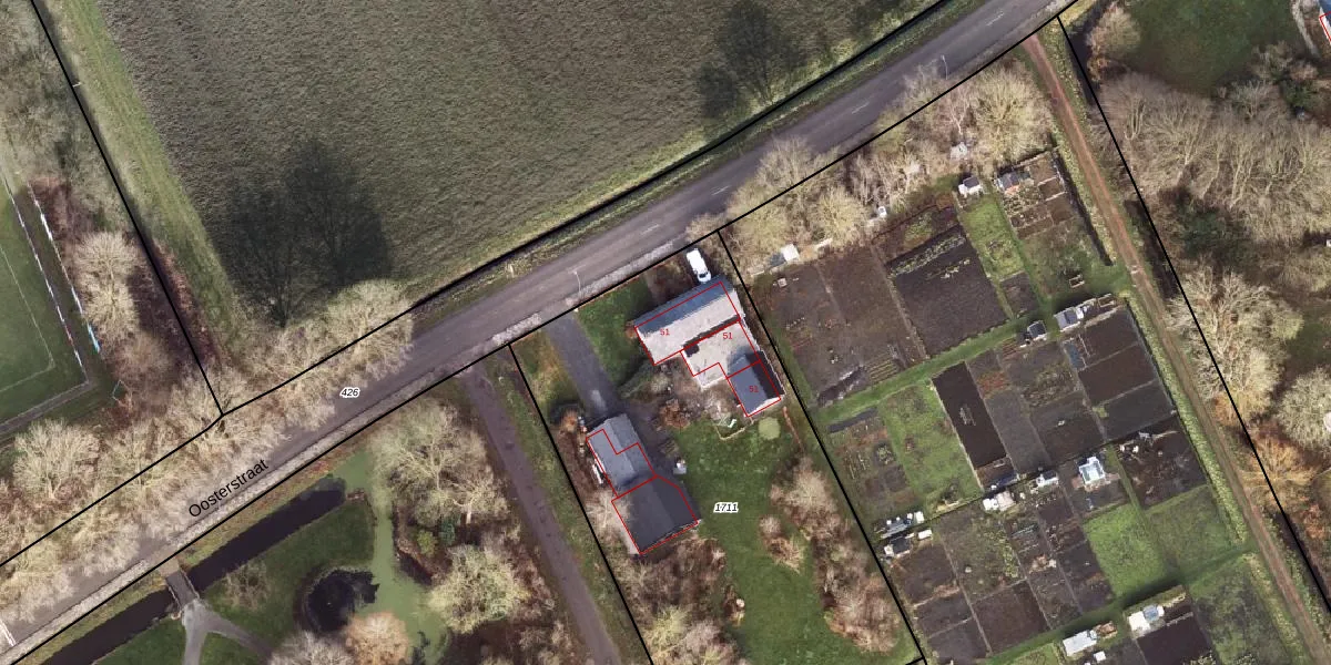 Het perceel waarop Oosterstraat 51 staat heeft een oppervlakte van 2530 m². Dit is een zeer groot perceel. De perceeloppervlakte wordt geregistreerd door het Kadaster. Gedetailleerde informatie over de maten van dit perceel kunt u vinden in het rapport Kadastrale kaart met maatvoering van Oosterstraat 51.
