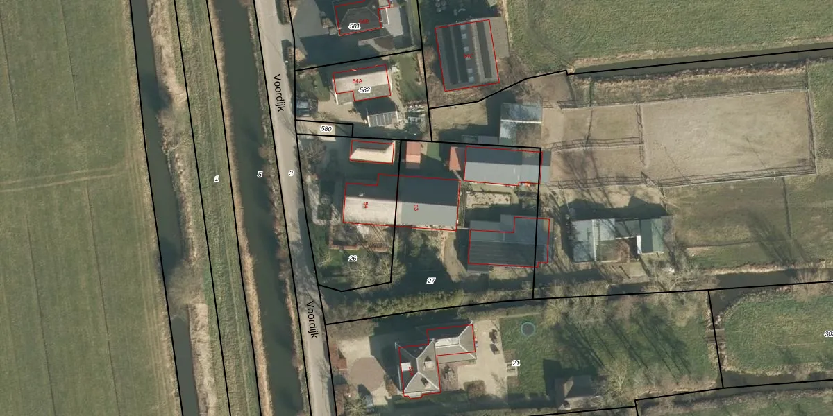 Het perceel waarop Voordijk 53 staat heeft een oppervlakte van 1420 m². Dit is een zeer groot perceel. De perceeloppervlakte wordt geregistreerd door het Kadaster. Gedetailleerde informatie over de maten van dit perceel kunt u vinden in het rapport Kadastrale kaart met maatvoering van Voordijk 53.