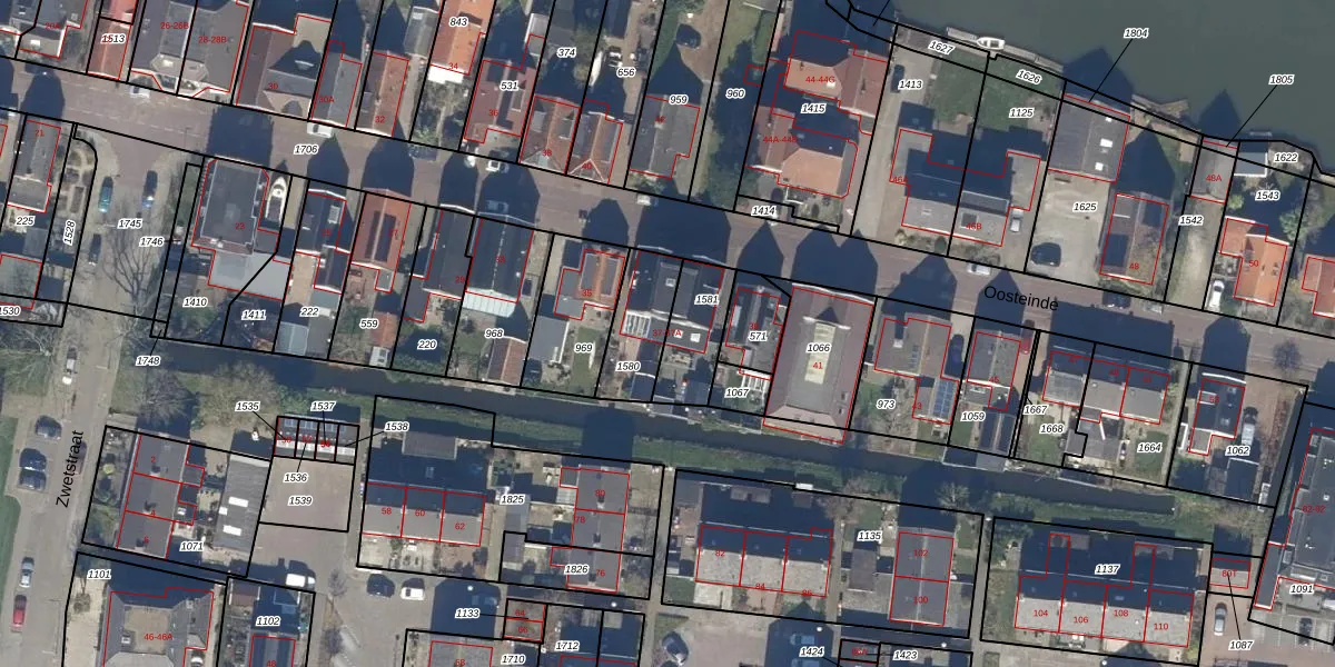 Het perceel waarop Oosteinde 37 staat heeft een oppervlakte van 173 m². Dit is een middelgroot perceel. De perceeloppervlakte wordt geregistreerd door het Kadaster. Gedetailleerde informatie over de maten van dit perceel kunt u vinden in het rapport Kadastrale kaart met maatvoering van Oosteinde 37.