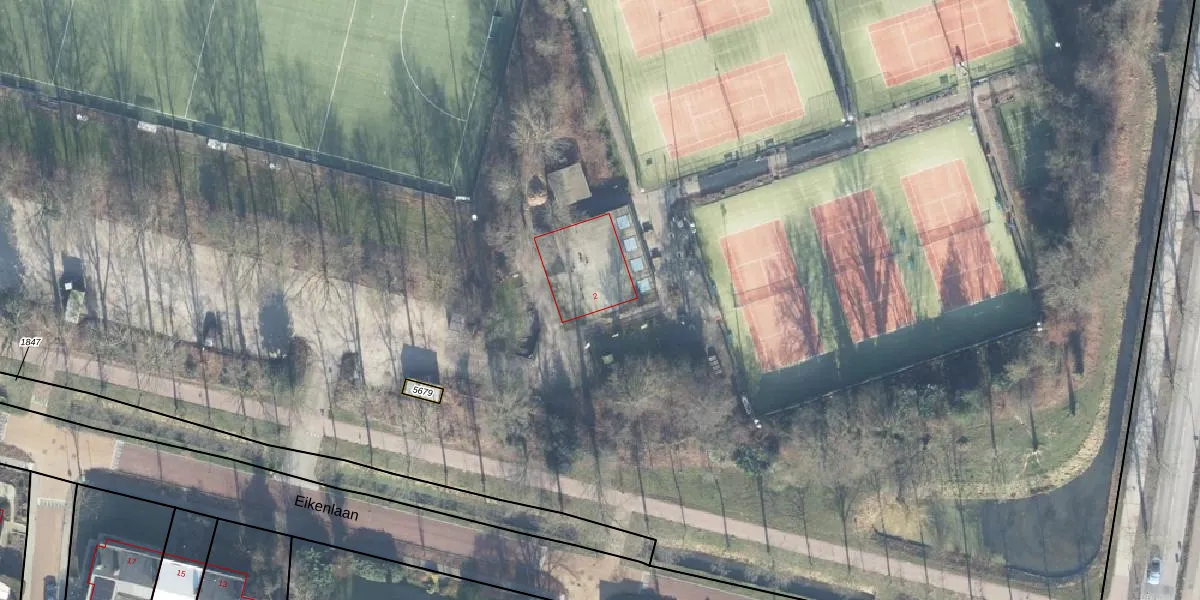 Het perceel waarop Eikenlaan 2 staat heeft een oppervlakte van 11,1 ha. Dit is een zeer groot perceel. De perceeloppervlakte wordt geregistreerd door het Kadaster. Gedetailleerde informatie over de maten van dit perceel kunt u vinden in het rapport Kadastrale kaart met maatvoering van Eikenlaan 2.