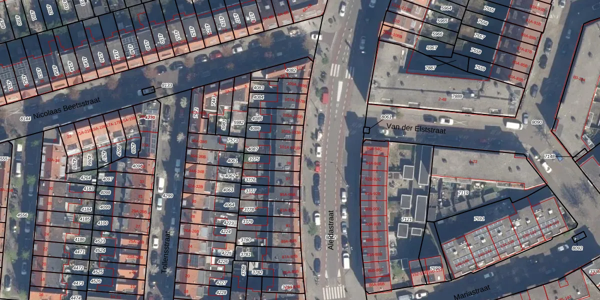 Het perceel waarop Aleidastraat 101-B staat heeft een oppervlakte van 99 m². Dit is een klein perceel. De perceeloppervlakte wordt geregistreerd door het Kadaster. Gedetailleerde informatie over de maten van dit perceel kunt u vinden in het rapport Kadastrale kaart met maatvoering van Aleidastraat 101-B.
