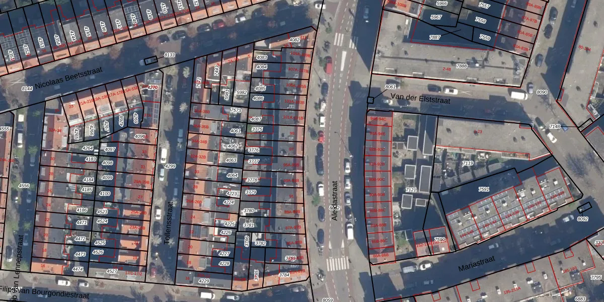 Gebruik de zoekbalk of klik op een perceel voor informatie over de adressen binnen dit perceel.
