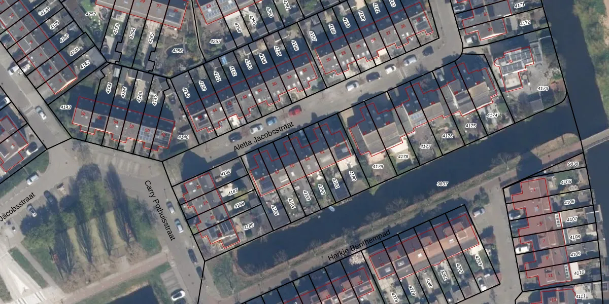 Aletta Jacobsstraat 53 is gelegen op kadastraal perceel SDM01Q4182. Deze kadastrale aanduiding is uniek en wordt gebruikt door het Kadaster om eigendomsrechten en andere zakelijke rechten vast te leggen. Het perceel maakt onderdeel uit van de kadastrale gemeente Schiedam.