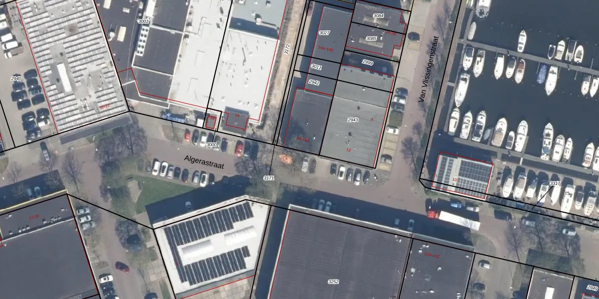 Algerastraat 14 is gelegen op kadastraal perceel SDM01P2942. Deze kadastrale aanduiding is uniek en wordt gebruikt door het Kadaster om eigendomsrechten en andere zakelijke rechten vast te leggen. Het perceel maakt onderdeel uit van de kadastrale gemeente Schiedam.