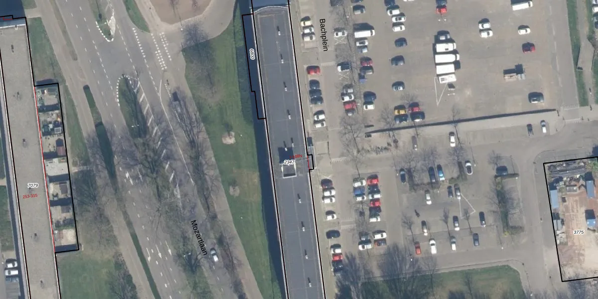 Het perceel waarop Bachplein 28 staat heeft een oppervlakte van 1384 m². Dit is een zeer groot perceel. De perceeloppervlakte wordt geregistreerd door het Kadaster. Gedetailleerde informatie over de maten van dit perceel kunt u vinden in het rapport Kadastrale kaart met maatvoering van Bachplein 28.
