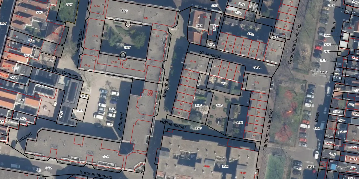 Het perceel waarop Bagijnhof 15 staat heeft een oppervlakte van 579 m². Dit is een groot perceel. De perceeloppervlakte wordt geregistreerd door het Kadaster. Gedetailleerde informatie over de maten van dit perceel kunt u vinden in het rapport Kadastrale kaart met maatvoering van Bagijnhof 15.