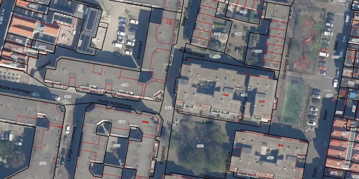 Het perceel waarop Bagijnhof 35 staat heeft een oppervlakte van 1700 m². Dit is een zeer groot perceel. De perceeloppervlakte wordt geregistreerd door het Kadaster. Gedetailleerde informatie over de maten van dit perceel kunt u vinden in het rapport Kadastrale kaart met maatvoering van Bagijnhof 35.