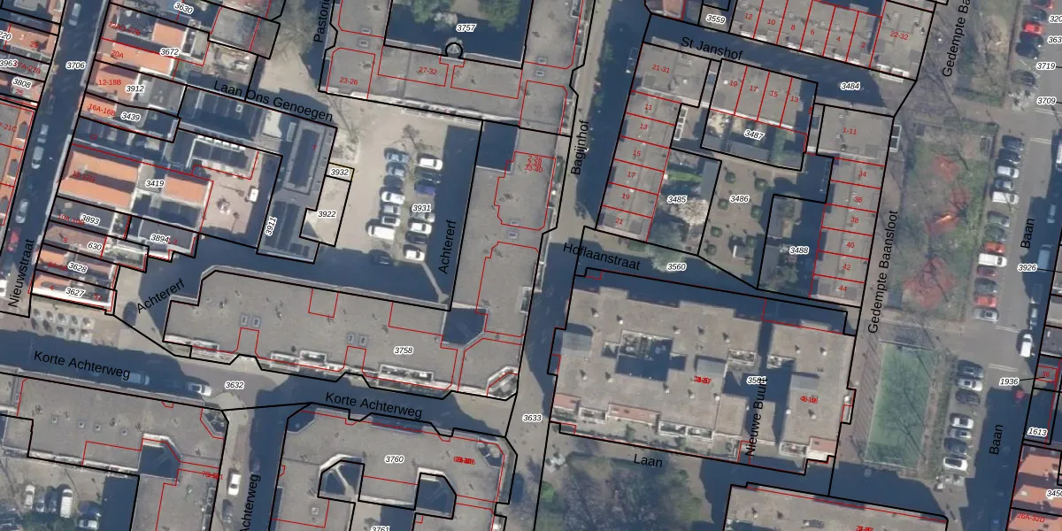 Het perceel waarop Bagijnhof 4 staat heeft een oppervlakte van 1590 m². Dit is een zeer groot perceel. De perceeloppervlakte wordt geregistreerd door het Kadaster. Gedetailleerde informatie over de maten van dit perceel kunt u vinden in het rapport Kadastrale kaart met maatvoering van Bagijnhof 4.