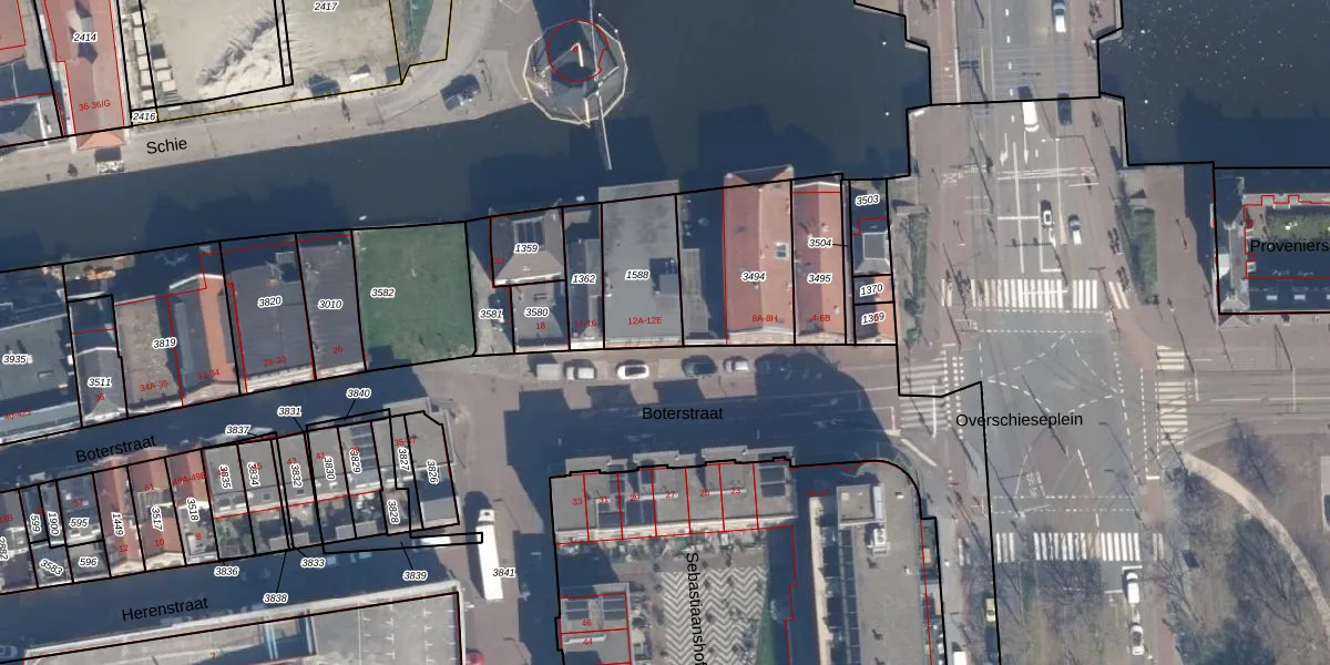 Boterstraat 12-A is gelegen op kadastraal perceel SDM01B1588. Deze kadastrale aanduiding is uniek en wordt gebruikt door het Kadaster om eigendomsrechten en andere zakelijke rechten vast te leggen. Het perceel maakt onderdeel uit van de kadastrale gemeente Schiedam.