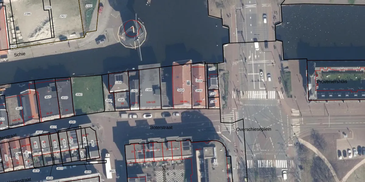 Boterstraat 8-A is gelegen op kadastraal perceel SDM01B3494. Deze kadastrale aanduiding is uniek en wordt gebruikt door het Kadaster om eigendomsrechten en andere zakelijke rechten vast te leggen. Het perceel maakt onderdeel uit van de kadastrale gemeente Schiedam.