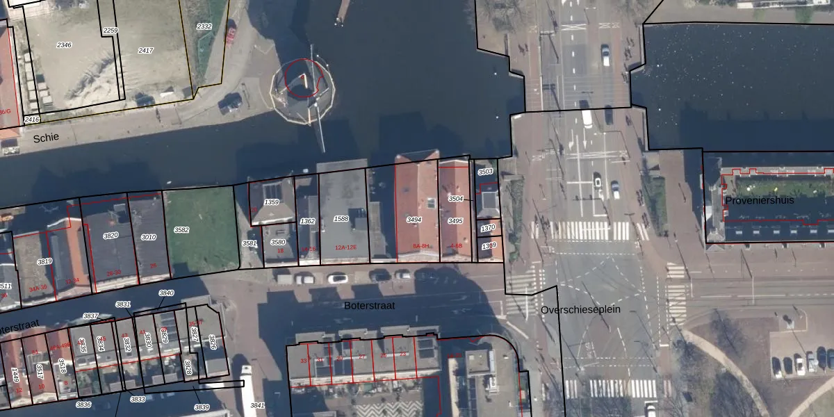 Boterstraat 8-B is gelegen op kadastraal perceel SDM01B3494. Deze kadastrale aanduiding is uniek en wordt gebruikt door het Kadaster om eigendomsrechten en andere zakelijke rechten vast te leggen. Het perceel maakt onderdeel uit van de kadastrale gemeente Schiedam.