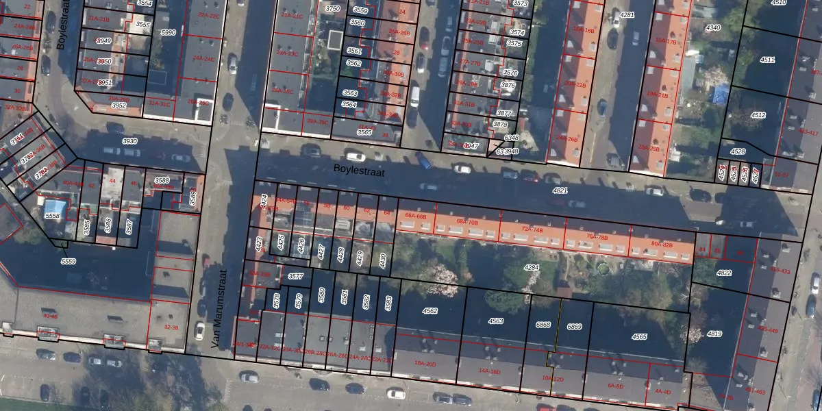 Het perceel waarop Boylestraat 66-B staat heeft een oppervlakte van 1457 m². Dit is een zeer groot perceel. De perceeloppervlakte wordt geregistreerd door het Kadaster. Gedetailleerde informatie over de maten van dit perceel kunt u vinden in het rapport Kadastrale kaart met maatvoering van Boylestraat 66-B.