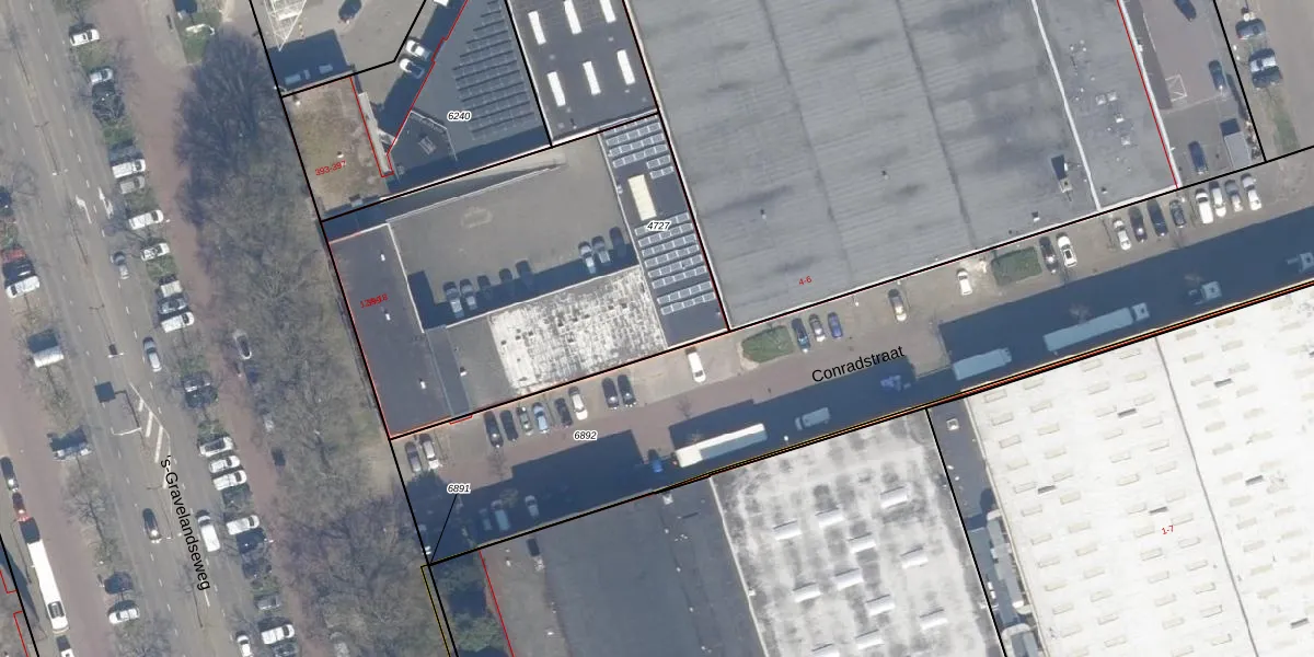 Het perceel waarop Conradstraat 12-B staat heeft een oppervlakte van 1896 m². Dit is een zeer groot perceel. De perceeloppervlakte wordt geregistreerd door het Kadaster. Gedetailleerde informatie over de maten van dit perceel kunt u vinden in het rapport Kadastrale kaart met maatvoering van Conradstraat 12-B.