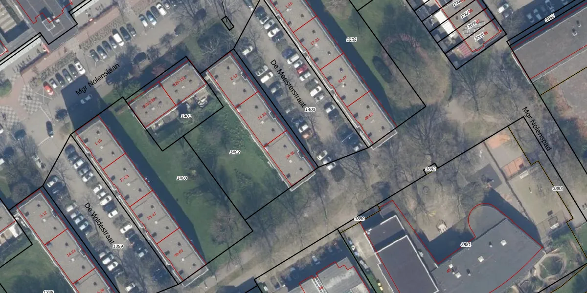 De Meesterstraat 32 is gelegen op kadastraal perceel SDM01H1402. Deze kadastrale aanduiding is uniek en wordt gebruikt door het Kadaster om eigendomsrechten en andere zakelijke rechten vast te leggen. Het perceel maakt onderdeel uit van de kadastrale gemeente Schiedam.