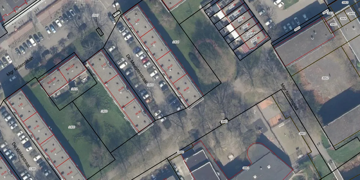 De Meesterstraat 59 is gelegen op kadastraal perceel SDM01H1404. Deze kadastrale aanduiding is uniek en wordt gebruikt door het Kadaster om eigendomsrechten en andere zakelijke rechten vast te leggen. Het perceel maakt onderdeel uit van de kadastrale gemeente Schiedam.