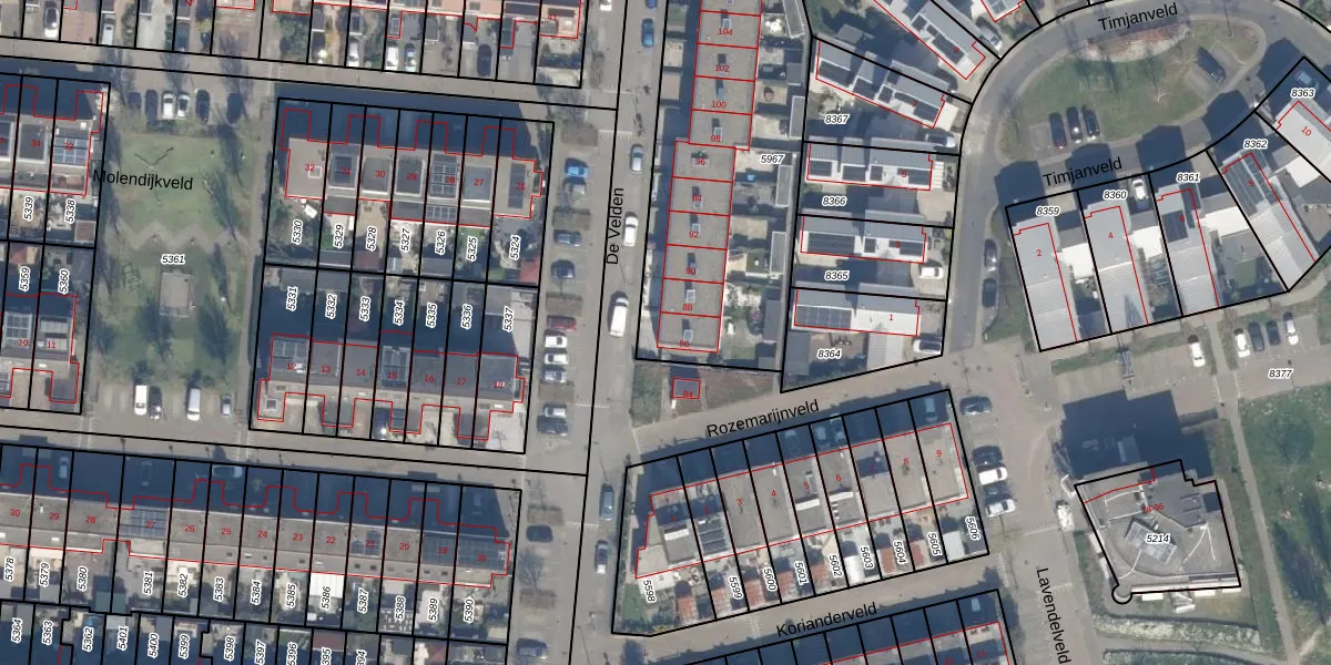 De Velden 86 is gelegen op kadastraal perceel SDM01Q5967. Deze kadastrale aanduiding is uniek en wordt gebruikt door het Kadaster om eigendomsrechten en andere zakelijke rechten vast te leggen. Het perceel maakt onderdeel uit van de kadastrale gemeente Schiedam.