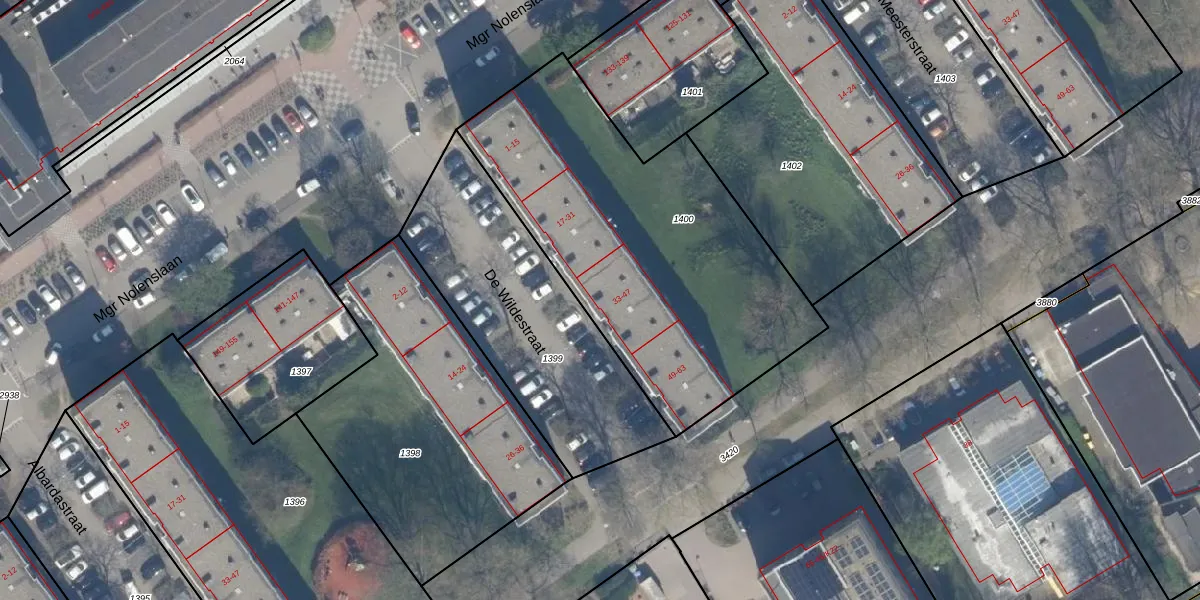De Wildestraat 39 is gelegen op kadastraal perceel SDM01H1400. Deze kadastrale aanduiding is uniek en wordt gebruikt door het Kadaster om eigendomsrechten en andere zakelijke rechten vast te leggen. Het perceel maakt onderdeel uit van de kadastrale gemeente Schiedam.