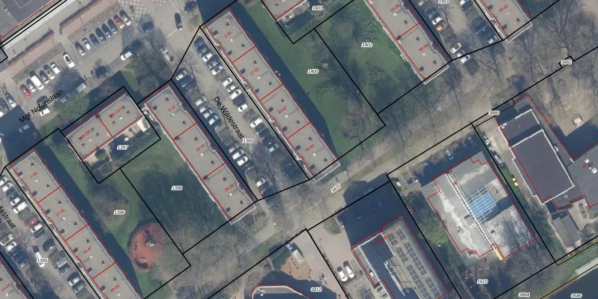 De Wildestraat 49 is gelegen op kadastraal perceel SDM01H1400. Deze kadastrale aanduiding is uniek en wordt gebruikt door het Kadaster om eigendomsrechten en andere zakelijke rechten vast te leggen. Het perceel maakt onderdeel uit van de kadastrale gemeente Schiedam.