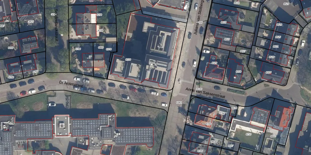 Het perceel waarop Dr Noletstraat 2-B-6 staat heeft een oppervlakte van 1965 m². Dit is een zeer groot perceel. De perceeloppervlakte wordt geregistreerd door het Kadaster. Gedetailleerde informatie over de maten van dit perceel kunt u vinden in het rapport Kadastrale kaart met maatvoering van Dr Noletstraat 2-B-6.