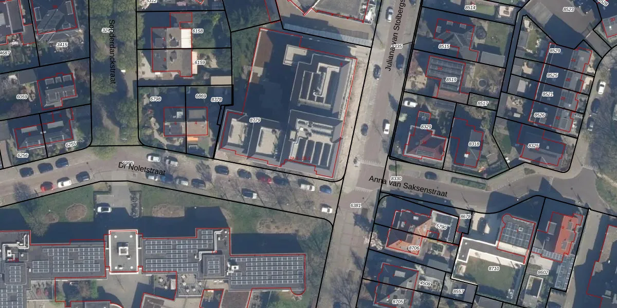 Het perceel waarop Dr Noletstraat 2-E-2 staat heeft een oppervlakte van 1965 m². Dit is een zeer groot perceel. De perceeloppervlakte wordt geregistreerd door het Kadaster. Gedetailleerde informatie over de maten van dit perceel kunt u vinden in het rapport Kadastrale kaart met maatvoering van Dr Noletstraat 2-E-2.