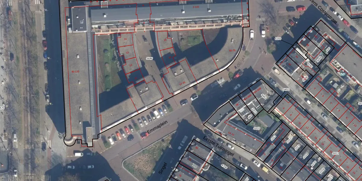 Het perceel waarop Emmaplein 17 staat heeft een oppervlakte van 6080 m². Dit is een zeer groot perceel. De perceeloppervlakte wordt geregistreerd door het Kadaster. Gedetailleerde informatie over de maten van dit perceel kunt u vinden in het rapport Kadastrale kaart met maatvoering van Emmaplein 17.