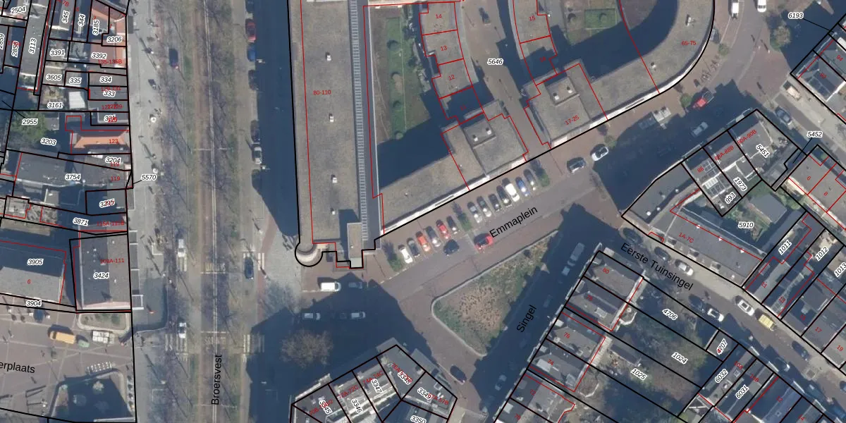 Het perceel waarop Emmaplein 2 staat heeft een oppervlakte van 6080 m². Dit is een zeer groot perceel. De perceeloppervlakte wordt geregistreerd door het Kadaster. Gedetailleerde informatie over de maten van dit perceel kunt u vinden in het rapport Kadastrale kaart met maatvoering van Emmaplein 2.