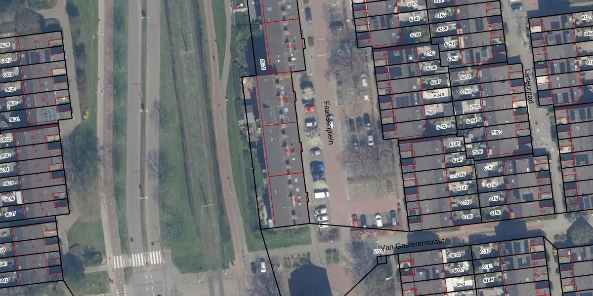 Het perceel waarop Faassenplein 23 staat heeft een oppervlakte van 2037 m². Dit is een zeer groot perceel. De perceeloppervlakte wordt geregistreerd door het Kadaster. Gedetailleerde informatie over de maten van dit perceel kunt u vinden in het rapport Kadastrale kaart met maatvoering van Faassenplein 23.
