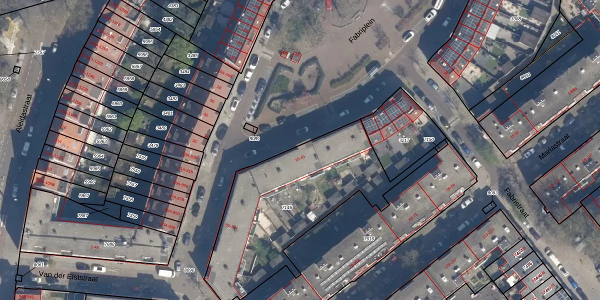 Het perceel waarop Fabriplein 23 staat heeft een oppervlakte van 1838 m². Dit is een zeer groot perceel. De perceeloppervlakte wordt geregistreerd door het Kadaster. Gedetailleerde informatie over de maten van dit perceel kunt u vinden in het rapport Kadastrale kaart met maatvoering van Fabriplein 23.