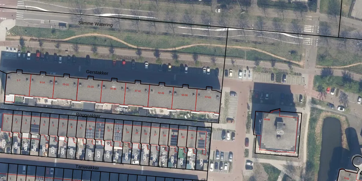 Het perceel waarop Gerstakker 54 staat heeft een oppervlakte van 2160 m². Dit is een zeer groot perceel. De perceeloppervlakte wordt geregistreerd door het Kadaster. Gedetailleerde informatie over de maten van dit perceel kunt u vinden in het rapport Kadastrale kaart met maatvoering van Gerstakker 54.