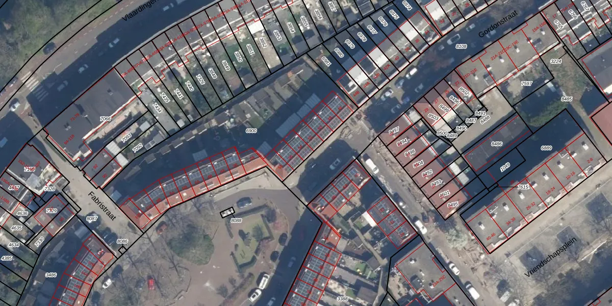 Gordonstraat 54 is gelegen op kadastraal perceel SDM01M6900. Deze kadastrale aanduiding is uniek en wordt gebruikt door het Kadaster om eigendomsrechten en andere zakelijke rechten vast te leggen. Het perceel maakt onderdeel uit van de kadastrale gemeente Schiedam.