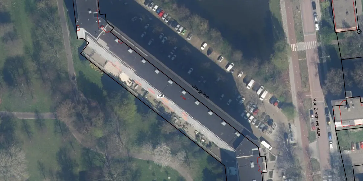 Het perceel waarop Griegplein 49 staat heeft een oppervlakte van 3940 m². Dit is een zeer groot perceel. De perceeloppervlakte wordt geregistreerd door het Kadaster. Gedetailleerde informatie over de maten van dit perceel kunt u vinden in het rapport Kadastrale kaart met maatvoering van Griegplein 49.