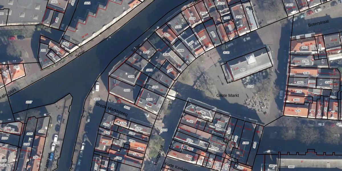 Grote Markt 21 is gelegen op kadastraal perceel SDM01B1303. Deze kadastrale aanduiding is uniek en wordt gebruikt door het Kadaster om eigendomsrechten en andere zakelijke rechten vast te leggen. Het perceel maakt onderdeel uit van de kadastrale gemeente Schiedam.