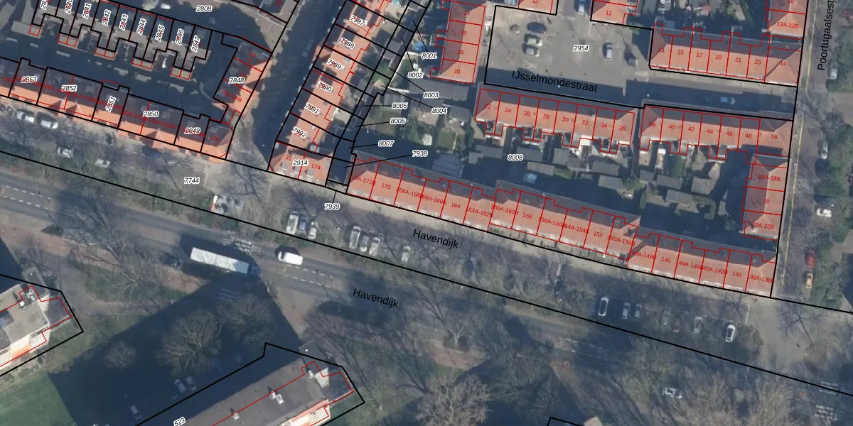 Het perceel waarop Havendijk 166-A staat heeft een oppervlakte van 4700 m². Dit is een zeer groot perceel. De perceeloppervlakte wordt geregistreerd door het Kadaster. Gedetailleerde informatie over de maten van dit perceel kunt u vinden in het rapport Kadastrale kaart met maatvoering van Havendijk 166-A.