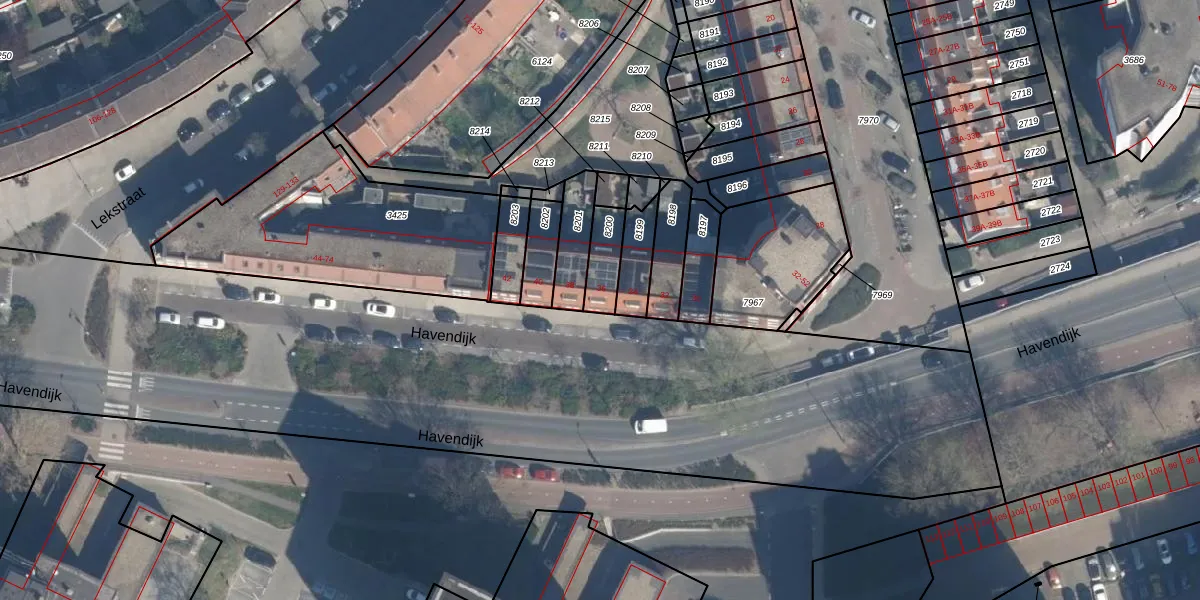 Het perceel waarop Havendijk 36 staat heeft een oppervlakte van 93 m². Dit is een klein perceel. De perceeloppervlakte wordt geregistreerd door het Kadaster. Gedetailleerde informatie over de maten van dit perceel kunt u vinden in het rapport Kadastrale kaart met maatvoering van Havendijk 36.