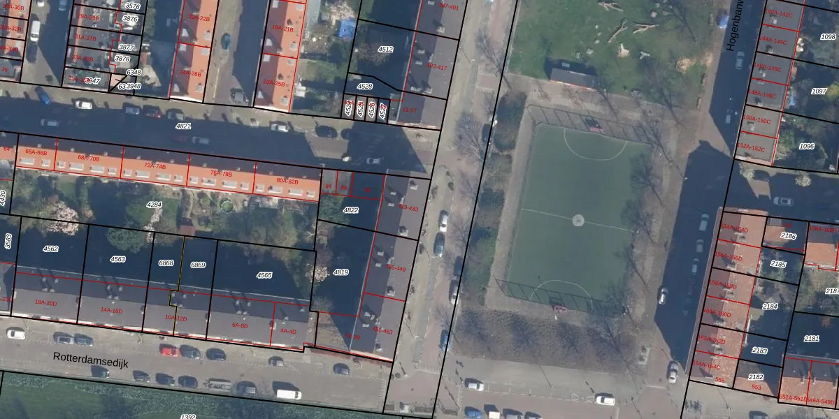 Hogenbanweg 421 is gelegen op kadastraal perceel SDM01I4822. Deze kadastrale aanduiding is uniek en wordt gebruikt door het Kadaster om eigendomsrechten en andere zakelijke rechten vast te leggen. Het perceel maakt onderdeel uit van de kadastrale gemeente Schiedam.