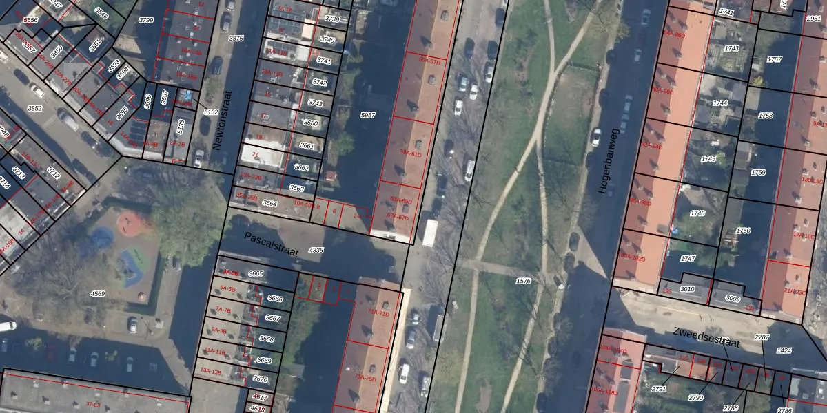 Hogenbanweg 65-D is gelegen op kadastraal perceel SDM01I5957. Deze kadastrale aanduiding is uniek en wordt gebruikt door het Kadaster om eigendomsrechten en andere zakelijke rechten vast te leggen. Het perceel maakt onderdeel uit van de kadastrale gemeente Schiedam.