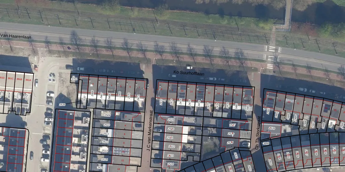 Ko Suurhofflaan 9 is gelegen op kadastraal perceel SDM01H2473. Deze kadastrale aanduiding is uniek en wordt gebruikt door het Kadaster om eigendomsrechten en andere zakelijke rechten vast te leggen. Het perceel maakt onderdeel uit van de kadastrale gemeente Schiedam.