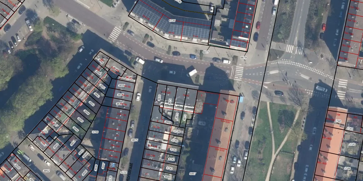 Het adres is gelegen op perceel 3872 in de sectie I en de kadastrale gemeente Schiedam. De kadastrale aanduiding is aldus SDM01-I-3872. Het perceel is 117 m² groot. Dat is kleiner dan de gemiddelde perceeloppervlakte in Schiedam, dat op 1011,07 m² ligt. Het grootste perceel in de kadastrale gemeente is 53,5 ha. Het kleinste perceel heeft een oppervlakte van 0 m². Op het perceel zijn 3 adressen aanwezig. De huidige grenzen van het perceel zijn digitaal in de Basisregistratie Kadaster (BRK) geregistreerd op 27-01-2003.