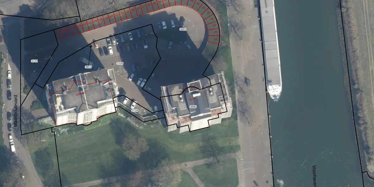 Het perceel waarop Maasboulevard 26 staat heeft een oppervlakte van 604 m². Dit is een groot perceel. De perceeloppervlakte wordt geregistreerd door het Kadaster. Gedetailleerde informatie over de maten van dit perceel kunt u vinden in het rapport Kadastrale kaart met maatvoering van Maasboulevard 26.