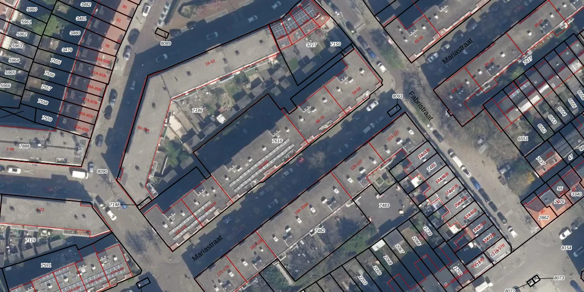 Het perceel waarop Mariastraat 82 staat heeft een oppervlakte van 1736 m². Dit is een zeer groot perceel. De perceeloppervlakte wordt geregistreerd door het Kadaster. Gedetailleerde informatie over de maten van dit perceel kunt u vinden in het rapport Kadastrale kaart met maatvoering van Mariastraat 82.
