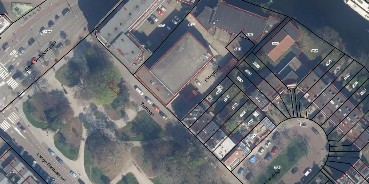 Het perceel waarop Odeonhof 30 staat heeft een oppervlakte van 2594 m². Dit is een zeer groot perceel. De perceeloppervlakte wordt geregistreerd door het Kadaster. Gedetailleerde informatie over de maten van dit perceel kunt u vinden in het rapport Kadastrale kaart met maatvoering van Odeonhof 30.