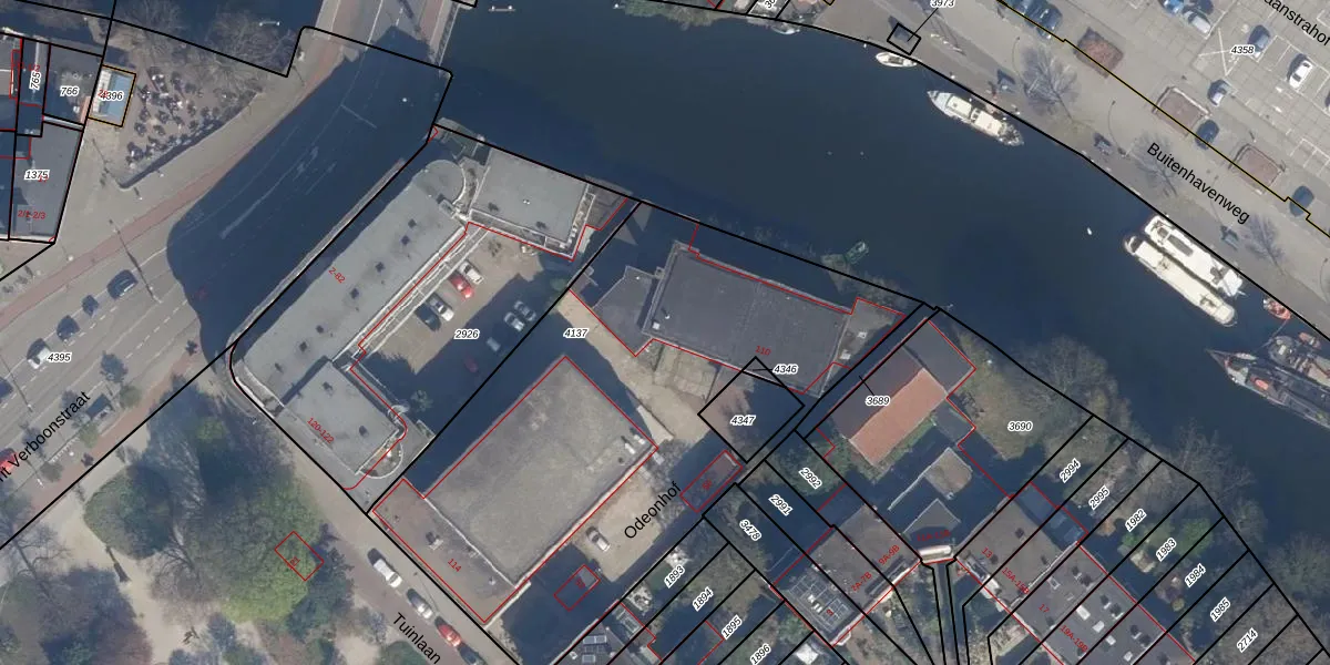 Het perceel waarop Odeonhof 45 staat heeft een oppervlakte van 2594 m². Dit is een zeer groot perceel. De perceeloppervlakte wordt geregistreerd door het Kadaster. Gedetailleerde informatie over de maten van dit perceel kunt u vinden in het rapport Kadastrale kaart met maatvoering van Odeonhof 45.
