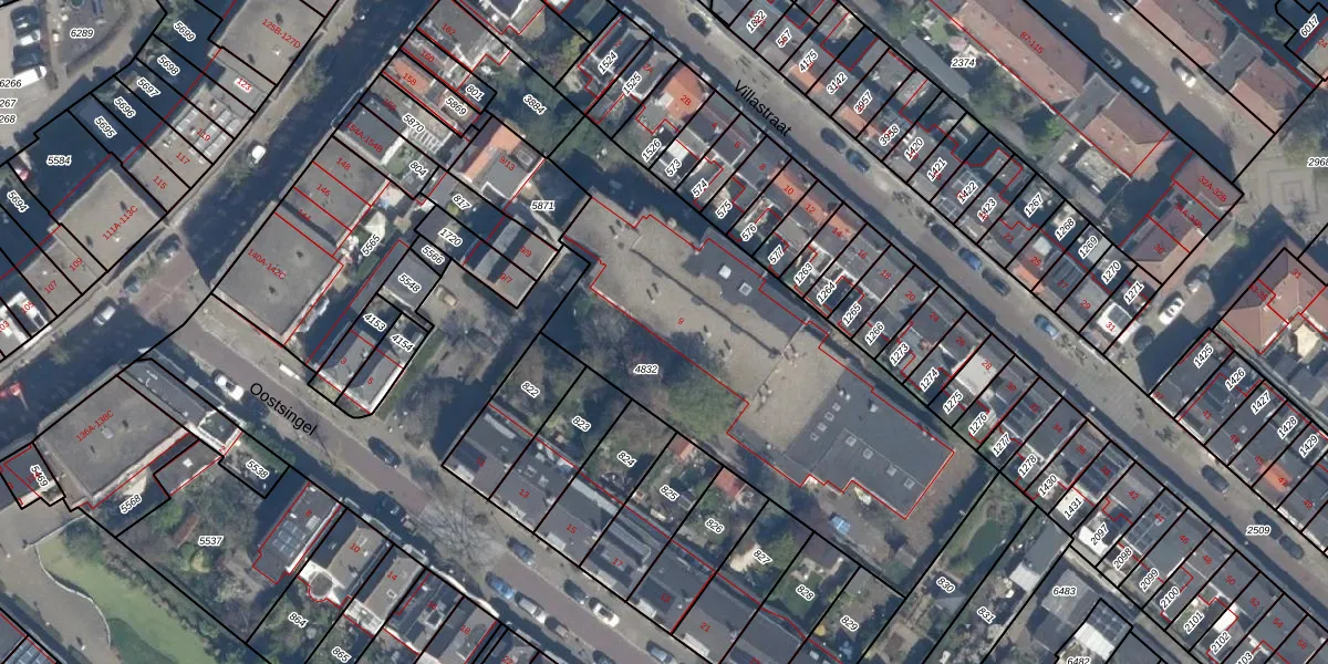 Het perceel waarop Oostsingel 9-F staat heeft een oppervlakte van 2046 m². Dit is een zeer groot perceel. De perceeloppervlakte wordt geregistreerd door het Kadaster. Gedetailleerde informatie over de maten van dit perceel kunt u vinden in het rapport Kadastrale kaart met maatvoering van Oostsingel 9-F.