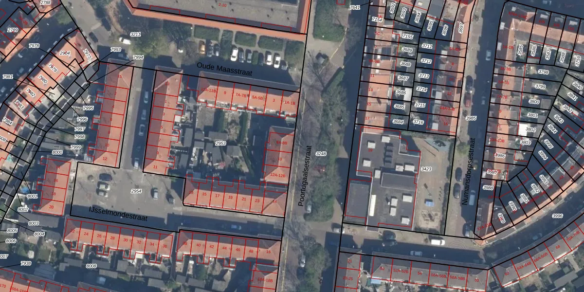 Het perceel waarop Poortugaalsestraat 8-A staat heeft een oppervlakte van 2069 m². Dit is een zeer groot perceel. De perceeloppervlakte wordt geregistreerd door het Kadaster. Gedetailleerde informatie over de maten van dit perceel kunt u vinden in het rapport Kadastrale kaart met maatvoering van Poortugaalsestraat 8-A.