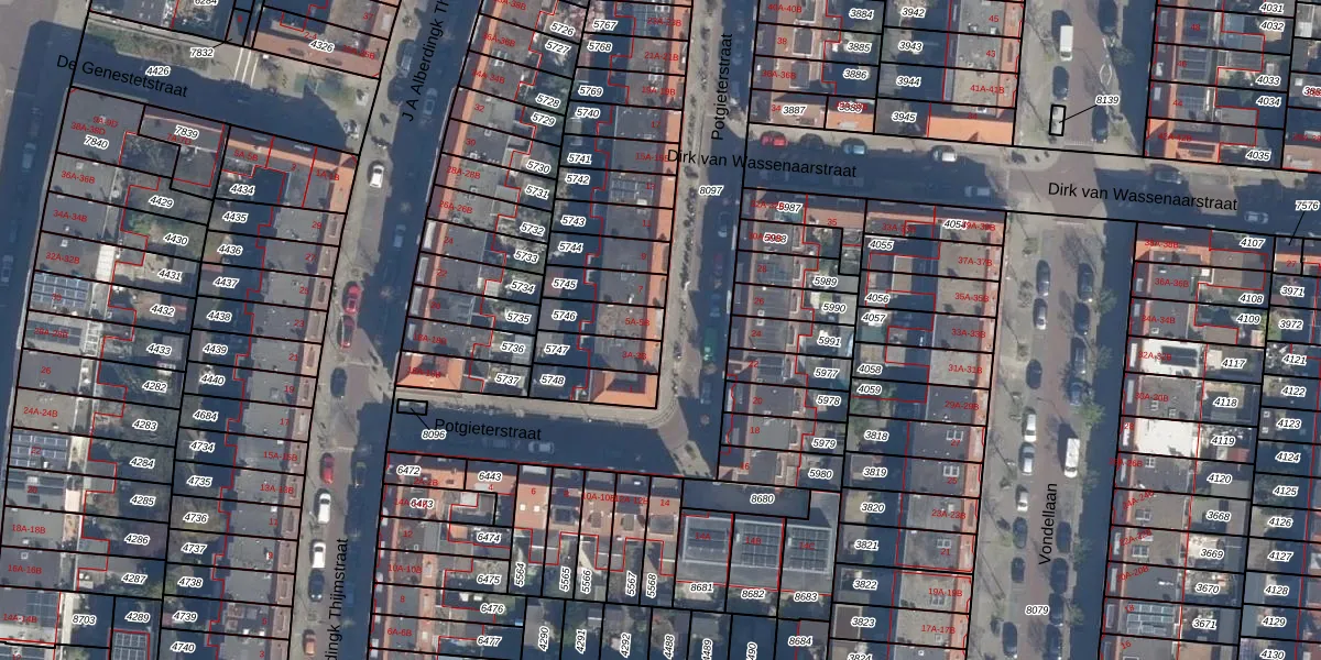 Het perceel waarop Potgieterstraat 5-B staat heeft een oppervlakte van 96 m². Dit is een klein perceel. De perceeloppervlakte wordt geregistreerd door het Kadaster. Gedetailleerde informatie over de maten van dit perceel kunt u vinden in het rapport Kadastrale kaart met maatvoering van Potgieterstraat 5-B.