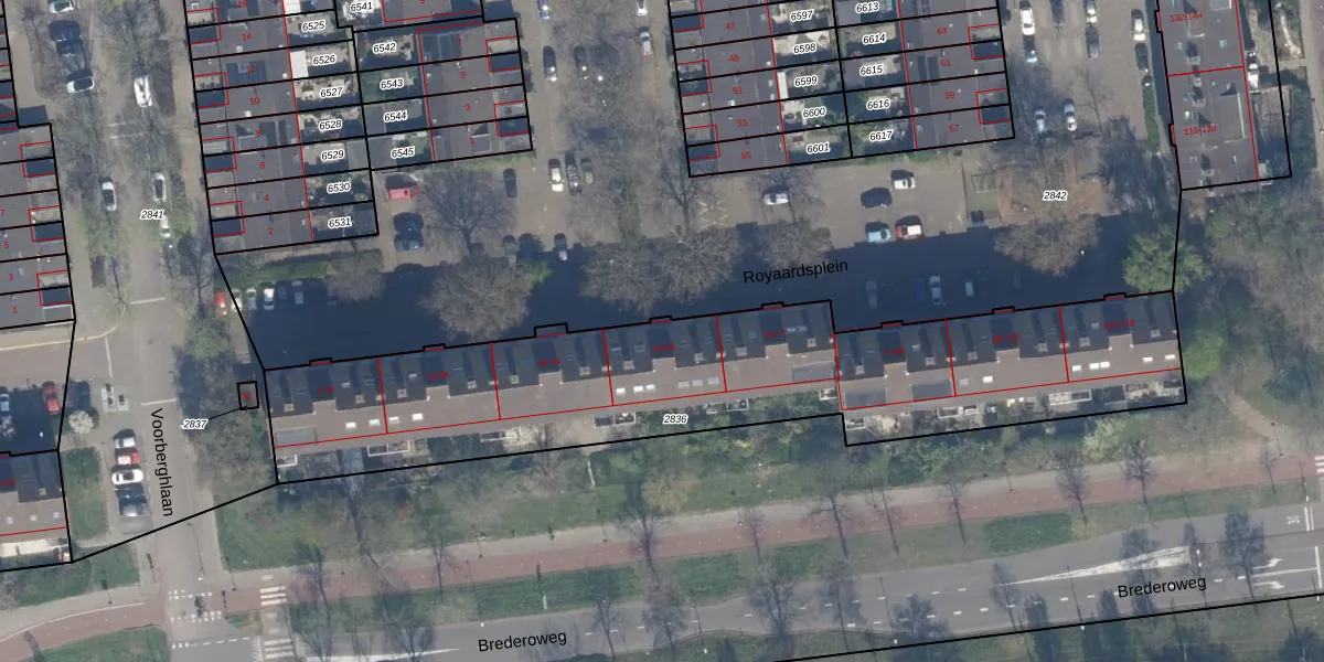 Het perceel waarop Royaardsplein 48 staat heeft een oppervlakte van 2330 m². Dit is een zeer groot perceel. De perceeloppervlakte wordt geregistreerd door het Kadaster. Gedetailleerde informatie over de maten van dit perceel kunt u vinden in het rapport Kadastrale kaart met maatvoering van Royaardsplein 48.