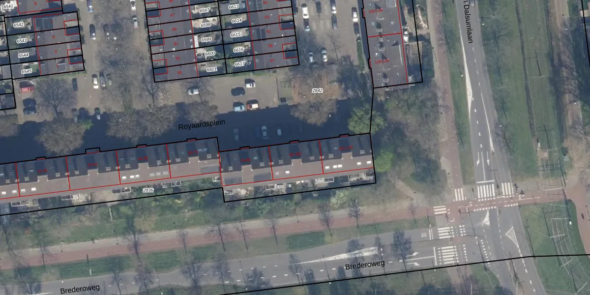 Het perceel waarop Royaardsplein 90 staat heeft een oppervlakte van 2330 m². Dit is een zeer groot perceel. De perceeloppervlakte wordt geregistreerd door het Kadaster. Gedetailleerde informatie over de maten van dit perceel kunt u vinden in het rapport Kadastrale kaart met maatvoering van Royaardsplein 90.