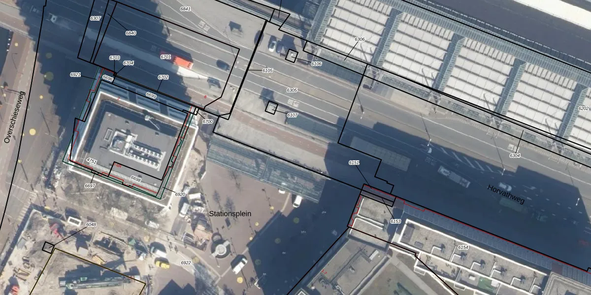Het perceel waarop Stationsplein 16 staat heeft een oppervlakte van 1630 m². Dit is een zeer groot perceel. De perceeloppervlakte wordt geregistreerd door het Kadaster. Gedetailleerde informatie over de maten van dit perceel kunt u vinden in het rapport Kadastrale kaart met maatvoering van Stationsplein 16.