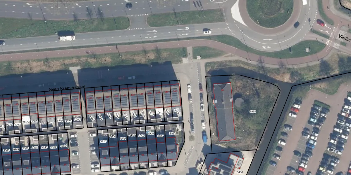 Sven Kramerstraat 142 is gelegen op kadastraal perceel SDM01Q9416. Deze kadastrale aanduiding is uniek en wordt gebruikt door het Kadaster om eigendomsrechten en andere zakelijke rechten vast te leggen. Het perceel maakt onderdeel uit van de kadastrale gemeente Schiedam.